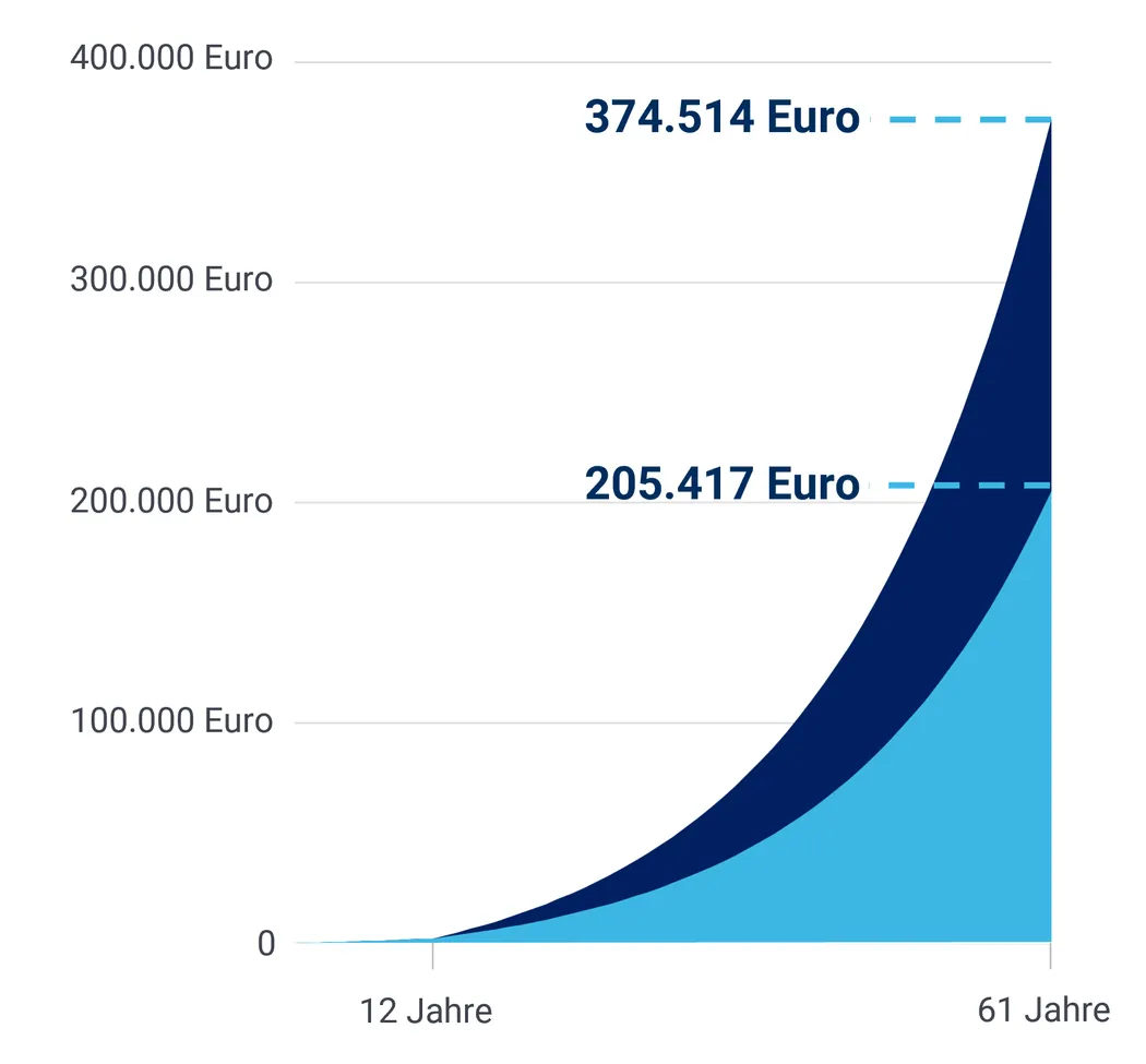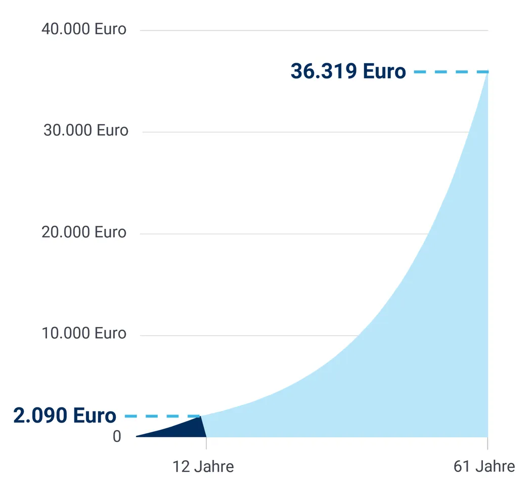 Bei einer angenommenen jährlichen Wertentwicklung von 6 % ergibt sich zum 18. Geburtstag bereits ein Depotwert von rund 2.090 Euro. Bis zum Renteneintritt nach 61 Jahren wächst das Kapital auf 36.319 Euro an.1